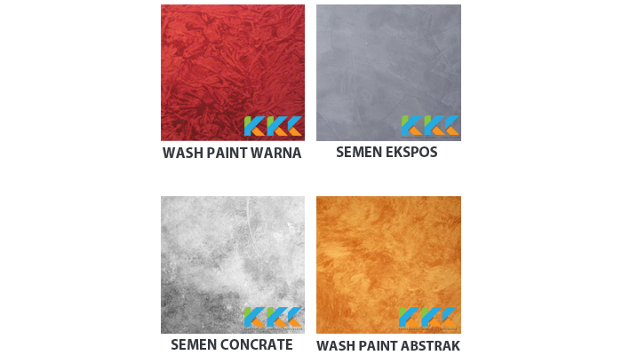 Ragam jenis cat wash ada beberapa macam, yang menarik dari cat ini adalah motifnya yang berbentuk abstrak namun memiliki ciri khas tersendiri yang mampu memberikan kesan atau efek natural, berikut contoh dibawah ini :